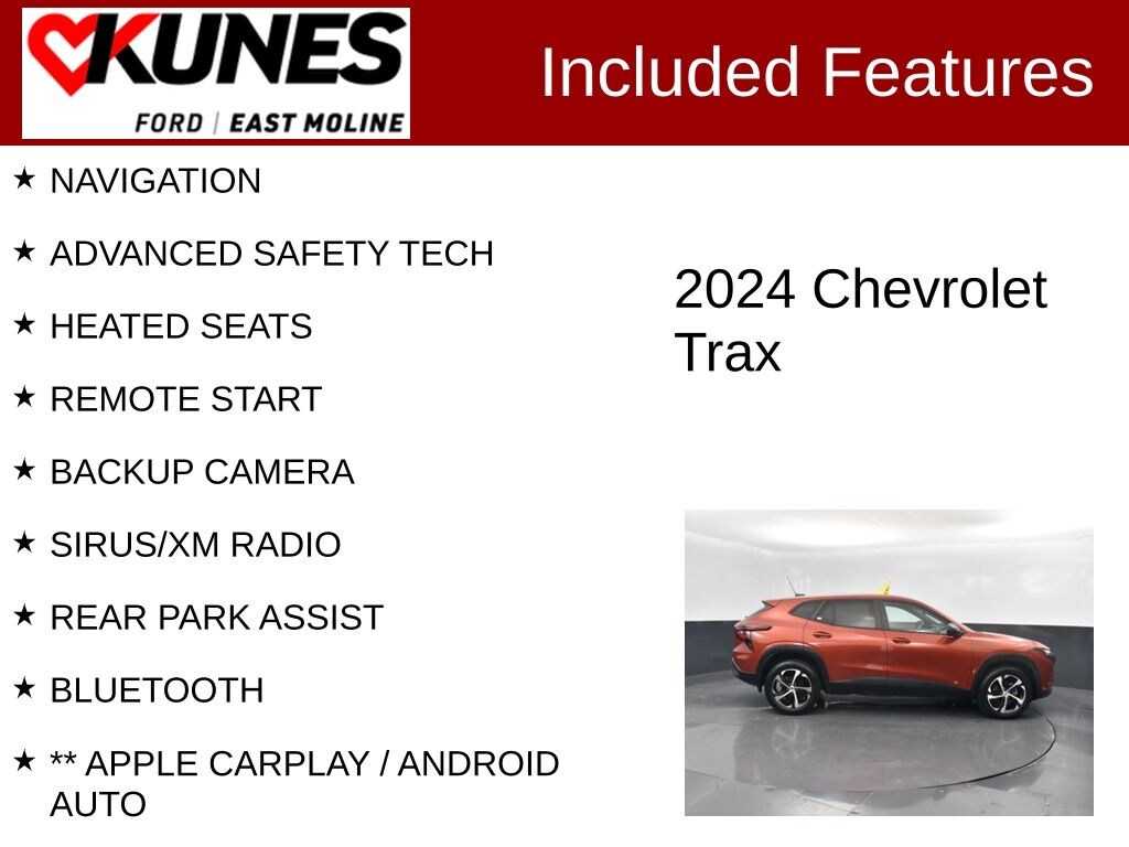 I have a 2024 2RS with the moonroof and wireless charging. The flat bottom steering wheel is extra nice when you get in or get out of the car, especially if you are a big person, like me. It gets great gas mileage, and it has plenty of power, contrary to what you may have heard. The golden yellow turns heads, and most are surprised, like I was, at the low price, considering it has heated seats, heated steering wheel, wireless charging, moonroof like cars which costs tens of thousands of dollars more. Safety: This is a big deal. It has blind spot monitor, adaptive Cruise control and these things make it safer to drive. The backup camera has dynamic lines showing you the approximate path of where you are going when backing up. The backup camera is fabutastic with great colors, dynamic lines and a large screen. My car has almost 4000 miles and my wife loves it. She never has any problem finding the car in a sea of thousands of cars in a parking lot, because the gold color sticks out for miles. Now, the bad: No car is perfect. This is no exception. The engine noise, with the small turbo, is more than I would like. I guess the worst part is that its "not a buick" and does not have a buick ride. Buick does make a "Trax" with its upgrades and calls it an Encore. If you are a "smooth ride affectionado" and are willing to pay more, I would recommend the Buick instead. For most people, tho, who want a new car under between 21,000 and 26,000, the Trax is the best bet. Its much larger than the Nissan Kicks, which is in a similar price range. I have previously driven a Honda CRV hybrid, but when Honda raised the price of a similar equipped (SEL) CRV hybrid to over $40,000, I quit buying Hondas. And, forget the Toyota RAV 4 hybrid, because those are never available, and, if you do find one, you dont get to pick the color or options, you drive what they got, and pay almost 40,000 for those, also. The Mazda CX5 may be a good "half way" improvement. The CX5 is probably 30 something thousand but a bit more upscale, but not an outrageous fortune like the Toyota and Honda. In short the 2024 TRAX is a bargain for those who need a low priced new car. It has more value than any other car, with a possible exception of the Maverick. (If you want to drive a baby truck instead of a car).