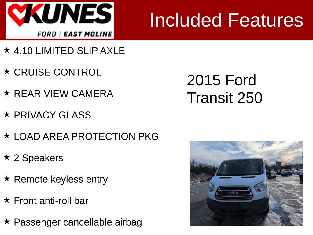 2015 Ford Transit-250 Oxford White 3.7L V6 Ti-VCT 24V 4.10 LIMITED SLIP AXLE, CRUISE CONTROL, REAR VIEW CAMERA, PRIVACY GLASS, LOAD AREA PROTECTION PKG, 2 Speakers, Brake assist, Driver door bin, Driver's Seat Mounted Armrest, Dual Bucket Seats, Electronic Stability Control, Front anti-roll bar, Front Bucket Seats, Front reading lights, Illuminated entry, Occupant sensing airbag, Panic alarm, Passenger cancellable airbag, Passenger door bin, Remote keyless entry, Tachometer, Telescoping steering wheel, Tilt steering wheel, Variably intermittent wipers, Vinyl Front Bucket Seats. Odometer is 22564 miles below market average!