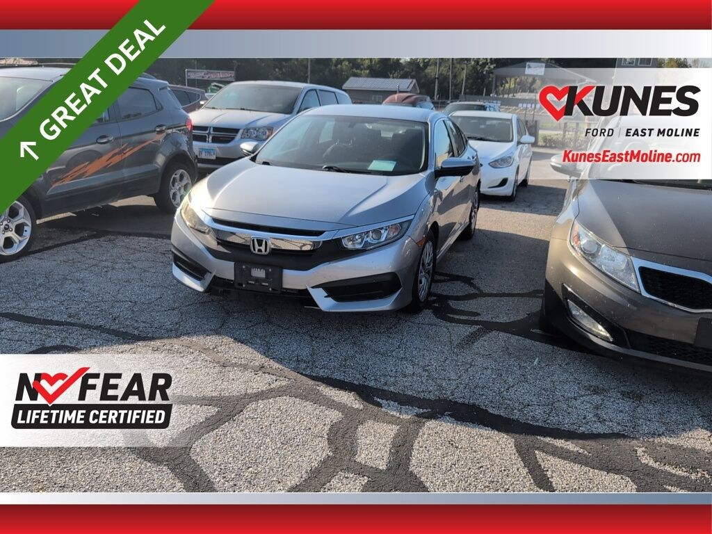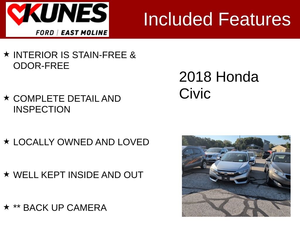 2018 Honda Civic LX Lunar Silver Metallic 2.0L I4 DOHC 16V i-VTEC INTERIOR IS STAIN-FREE & ODOR-FREE, COMPLETE DETAIL AND INSPECTION, LOCALLY OWNED AND LOVED, WELL KEPT INSIDE AND OUT, ** BACK UP CAMERA, Black Cloth. Odometer is 5046 miles below market average! 31/40 City/Highway MPG