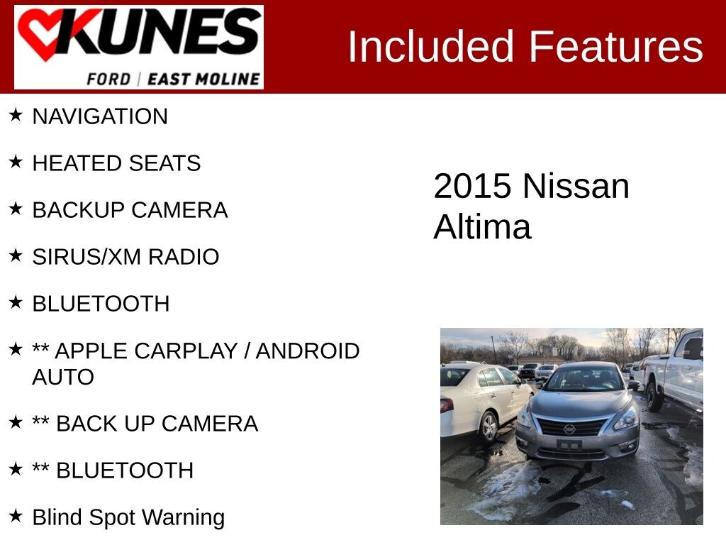 2015 Nissan Altima 2.5 SL Gun Metallic 2.5L I4 DOHC 16V NAVIGATION, HEATED SEATS, BACKUP CAMERA, SIRUS/XM RADIO, BLUETOOTH, ** APPLE CARPLAY / ANDROID AUTO, ** BACK UP CAMERA, ** BLUETOOTH, CVT with Xtronic, Blind Spot Warning, Lane Departure Warning System. 27/38 City/Highway MPG