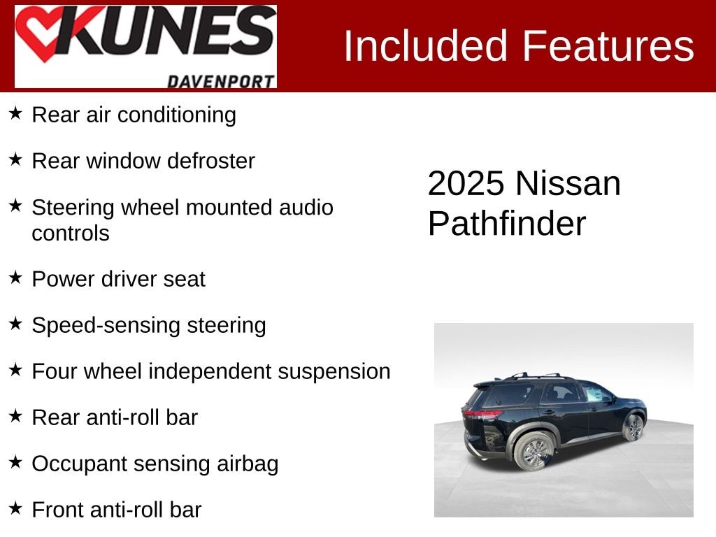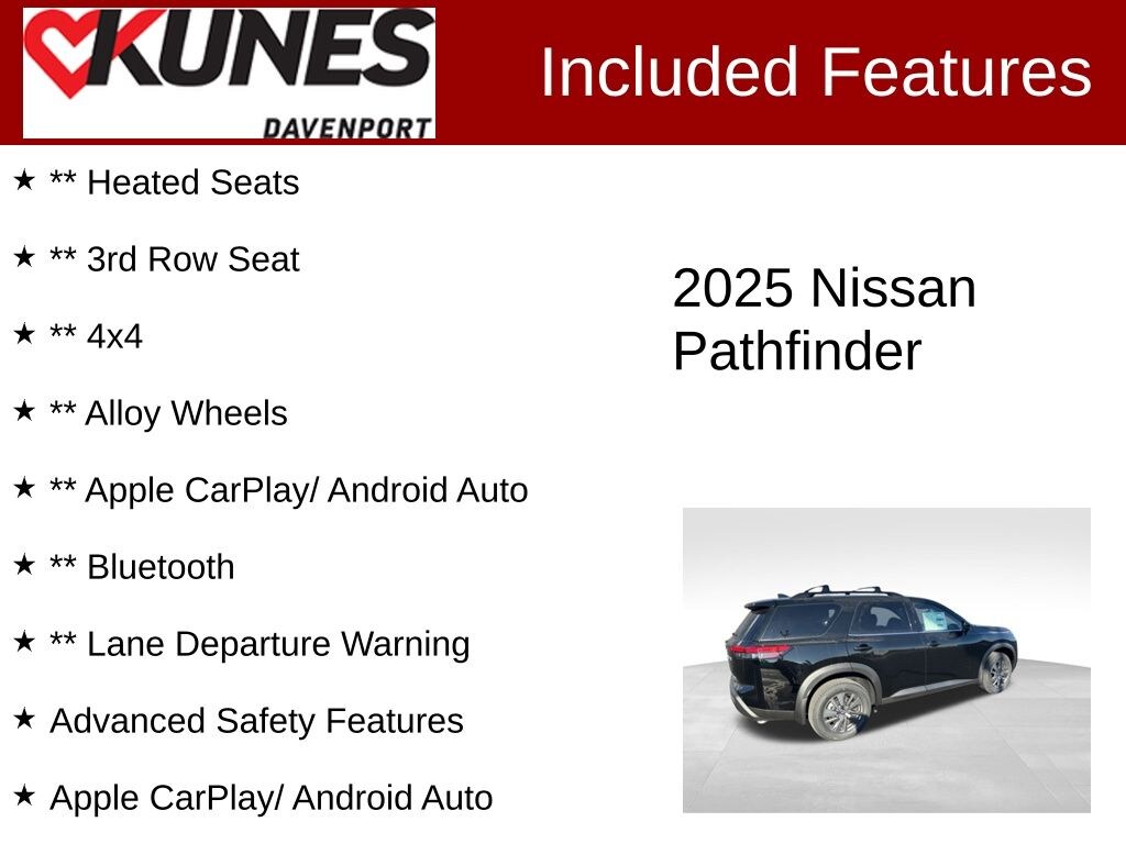 Super Black 2025 Nissan Pathfinder SV ** Heated Seats, ** 3rd Row Seat, ** 4x4, ** Alloy Wheels, ** Apple CarPlay/ Android Auto, ** Bluetooth, ** Lane Departure Warning, Advanced Safety Features, Apple CarPlay/ Android Auto, 4WD, 4-Wheel Disc Brakes, Auto High-beam Headlights, Brake assist, Bumpers: body-color, Driver door bin, Electronic Stability Control, Four wheel independent suspension, Front anti-roll bar, Front Bucket Seats, Front Center Armrest, Front reading lights, Fully automatic headlights, Heated door mirrors, Illuminated entry, Knee airbag, Leather steering wheel, Low tire pressure warning, Occupant sensing airbag, Outside temperature display, Overhead console, Panic alarm, Passenger door bin, Passenger vanity mirror, Power door mirrors, Power driver seat, Power Liftgate, Rear air conditioning, Rear anti-roll bar, Rear reading lights, Rear seat center armrest, Rear side impact airbag, Rear window defroster, Rear window wiper, Reclining 3rd row seat, Security system, Speed control, Speed-sensing steering, Split folding rear seat, Spoiler, Steering wheel mounted audio controls, Tachometer, Telescoping steering wheel, Tilt steering wheel, Trip computer, Turn signal indicator mirrors, Variably intermittent wipers.