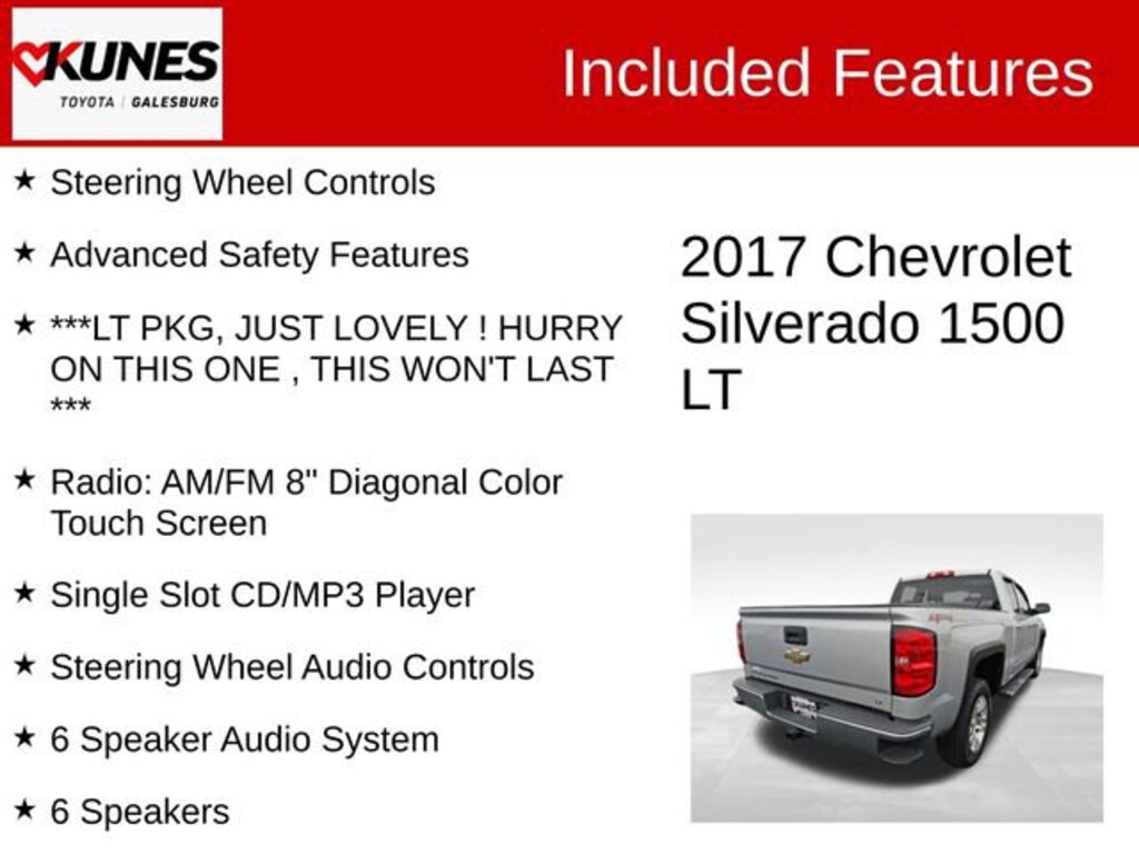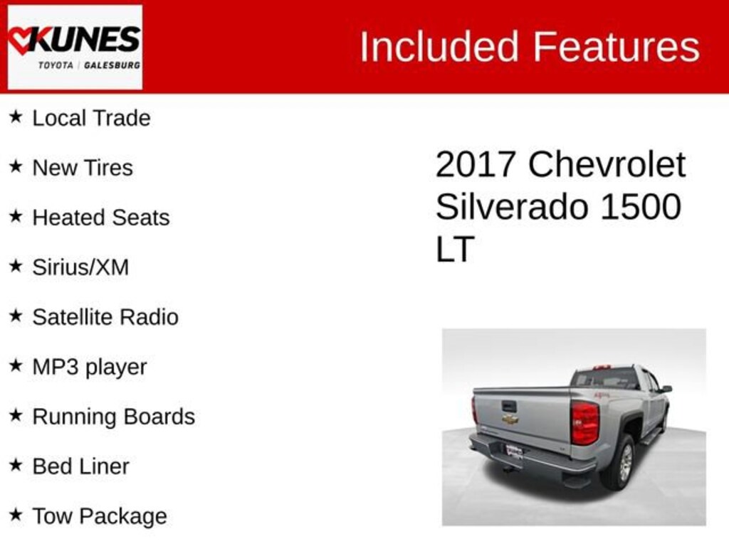 2017 Chevrolet Silverado 1500 LT LT1 Silver Ice Metallic Recent Arrival! LT1 Local Trade, New Tires, Heated Seats, Sirius/XM, Satellite Radio, MP3 player, Running Boards, Bed Liner, Tow Package, Steering Wheel Controls, Advanced Safety Features, ***LT PKG, JUST LOVELY ! HURRY ON THIS ONE , THIS WON'T LAST ***, 6-Speed Automatic Electronic with Overdrive, 4WD, Black Cloth, 10-Way Power Driver's Seat Adjuster, 150 Amp Alternator, 4.2" Diagonal Color Display Driver Info Center, 40/20/40 Front Split Bench Seat, 6 Speaker Audio System, 6 Speakers, 6" Rectangular Chromed Tubular Assist Steps (LPO), Color-Keyed Carpeting w/Rubberized Vinyl Floor Mats, Compass, Driver door bin, Driver vanity mirror, Electric Rear-Window Defogger, Emergency communication system: OnStar Guidance, Front anti-roll bar, Front Center Armrest w/Storage, Front Chrome Bumper, Front reading lights, Front wheel independent suspension, Fully automatic headlights, Heated Driver & Front Passenger Seats, Illuminated entry, Manual Tilt Wheel Steering Column, Manual Tilt/Telescoping Steering Column, Occupant sensing airbag, OnStar 3 Months Guidance Plan, OnStar w/4G LTE, Outside temperature display, Overhead airbag, Overhead console, Panic alarm, Passenger door bin, Passenger vanity mirror, Power Windows w/Driver Express Up, Premium audio system: Chevrolet MyLink, Radio data system, Radio: AM/FM 8" Diagonal Color Touch Screen, Rear 60/40 Folding Bench Seat (Folds Up), Rear Chrome Bumper, Rear reading lights, Rear step bumper, Rear Wheelhouse Liners, Remote keyless entry, Remote Vehicle Starter System, Single Slot CD/MP3 Player, Speed control, Speed-sensing steering, Split folding rear seat, Spray-On Pickup Box Bed Liner, Steering Wheel Audio Controls, Steering wheel mounted audio controls, Theft Deterrent System (Unauthorized Entry), Thin Profile LED Fog Lamps, Trip computer, Variably intermittent wipers.