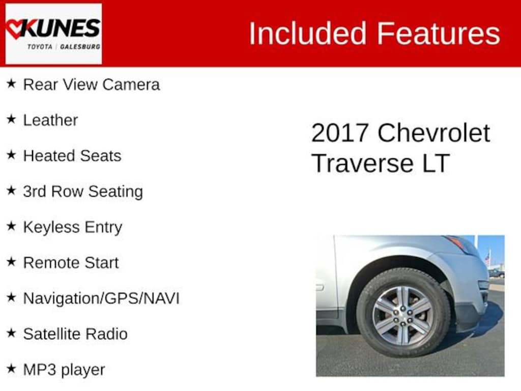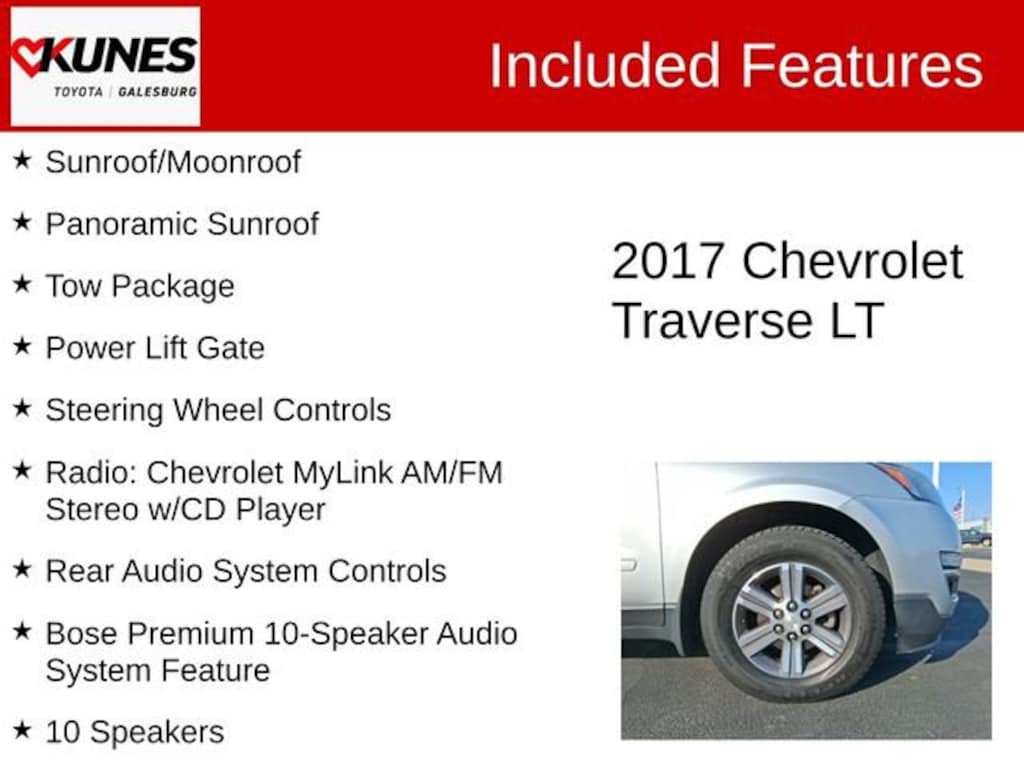 2017 Chevrolet Traverse 2LT 2LT Silver Ice Metallic Recent Arrival! 2LT Rear View Camera, Leather, Heated Seats, 3rd Row Seating, Keyless Entry, Remote Start, Navigation/GPS/NAVI, Satellite Radio, MP3 player, Sunroof/Moonroof, Panoramic Sunroof, Tow Package, Power Lift Gate, Steering Wheel Controls, AWD, 10 Speakers, AM/FM radio: SiriusXM, Automatic temperature control, Bluetooth® For Phone, Bose Premium 10-Speaker Audio System Feature, Brake assist, CD player, Delay-off headlights, Dual SkyScape 2-Panel Power Sunroof, Enhanced Driver Information Center, Exterior Parking Camera Rear, Front dual zone A/C, Front fog lights, NavTraffic, Panic alarm, Power Windows w/Driver Express-Up & Down, Premium Cloth Seat Trim, Radio data system, Radio: Chevrolet MyLink AM/FM Stereo w/CD Player, Rear air conditioning, Rear audio controls, Rear Audio System Controls, Rear Power Liftgate, Security system, Tri-Zone Automatic Climate Control.