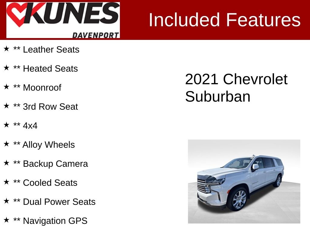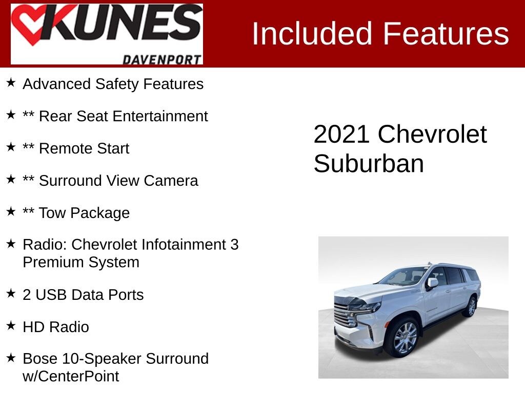 ** Leather Seats, ** Heated Seats, ** Moonroof, ** 3rd Row Seat, ** 4x4, ** Alloy Wheels, ** Backup Camera, ** Cooled Seats, ** Dual Power Seats, ** Navigation GPS, Advanced Safety Features, ** Rear Seat Entertainment, ** Remote Start, ** Surround View Camera, ** Tow Package, 10 Speakers, 12-Way Power Driver & Passenger Seat Adjusters, 1st & 2nd Row Color-Keyed Carpeted Floor Mats, 2 USB Data Ports, 3.23 Rear Axle Ratio, 3rd Row 60/40 Power-Folding Split-Bench, 3rd row seats: split-bench, Adaptive Cruise Control, Advanced Trailering System, Alloy wheels, Auto High-beam Headlights, Auto-dimming door mirrors, Auto-leveling suspension, Automatic Heated Steering Wheel, Bose 10-Speaker Surround w/CenterPoint, Brake assist, Bright Front & Rear Door Sill Plates, Bumpers: body-color, Chrome Door Handles w/Body-Color Strip, Color-Keyed Carpeting Floor Covering, Compass, Delay-off headlights, Driver door bin, Driver vanity mirror, Dual Exhaust System, Electronic Stability Control, Emergency communication system: OnStar and Chevrolet connected services capable, Enhanced Automatic Emergency Braking, Enhanced Driver Information Center, Extra Capacity Cooling System, Floor Console w/Storage Area, Front & Rear Park Assist, Front anti-roll bar, Front Bucket Seats, Front Center Armrest, Front reading lights, Fully automatic headlights, Garage door transmitter, Hands-Free Rear Power Programmable Liftgate, HD Radio, Heated 2nd Row Outboard Seats, Heated Driver & Front Passenger Seats, Heated front seats, Heated rear seats, Hill Descent Control, Hitch Guidance w/Hitch View, Illuminated entry, Infotainment Display, Integrated Trailer Brake Controller, Leather steering wheel, Leather-Wrapped Steering Wheel, LED Daytime Running Lamps, Low tire pressure warning, Occupant sensing airbag, Outside temperature display, Overhead airbag, Overhead console, Panic alarm, Passenger door bin, Passenger vanity mirror, Perforated Leather Seating Surfaces, Power door mirrors, Power Liftgate, Power passenger seat, Power Release 2nd Row Bucket Seats, Power Tilt & Telescopic Steering Column, Power windows, Power-Retractable Assist Steps, Premium audio system: Chevrolet Infotainment 3 Premium, Radio: Chevrolet Infotainment 3 Premium System, Rear anti-roll bar, Rear Camera Mirror Washer, Rear Pedestrian Alert, Rear reading lights, Rear window wiper, Remote Start, Roof rack: rails only, Safety Alert Seat, Security system, Speed control, Speed-sensing steering, Split folding rear seat, Spoiler, Steering wheel memory, Steering wheel mounted audio controls, Tachometer, Telescoping steering wheel, Tilt steering wheel, Trip computer, Variably intermittent wipers, Ventilated front seats, Voltmeter, Wheel Locks (Set of 4) (LPO), Wheels: 22" x 9" Sterling Silver Premium Painted.