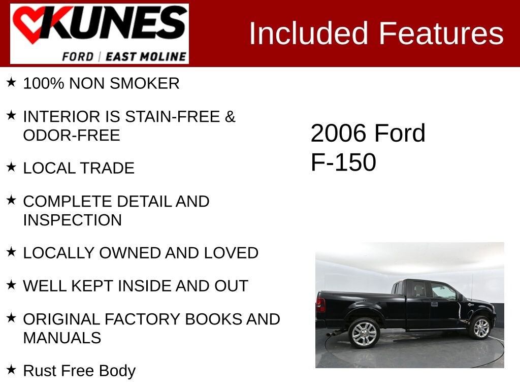 2006 Ford F-150 Harley-Davidson Black Clearcoat 5.4L V8 EFI 24V Clean CARFAX. 100% NON SMOKER, INTERIOR IS STAIN-FREE & ODOR-FREE, LOCAL TRADE, COMPLETE DETAIL AND INSPECTION, LOCALLY OWNED AND LOVED, WELL KEPT INSIDE AND OUT, ORIGINAL FACTORY BOOKS AND MANUALS, Rust Free Body, 5.4L V8 EFI 24V, 4WD, ABS brakes, Alloy wheels, Compass, Heated door mirrors, Illuminated entry, Remote keyless entry. Odometer is 113383 miles below market average!