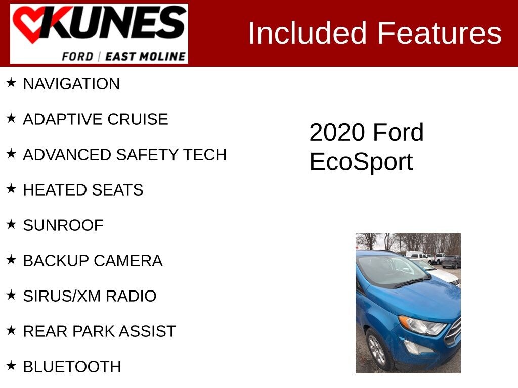 2020 Ford EcoSport SE Blue Candy EcoBoost 1.0L I3 GTDi DOHC Turbocharged VCT CARFAX One-Owner. NAVIGATION, ADAPTIVE CRUISE, ADVANCED SAFETY TECH, HEATED SEATS, SUNROOF, BACKUP CAMERA, SIRUS/XM RADIO, REAR PARK ASSIST, BLUETOOTH, ** APPLE CARPLAY / ANDROID AUTO, ** BACK UP CAMERA, ** BLUETOOTH, 110V/150W AC Power Outlet, 3.44 Axle Ratio, 6 Speakers, 7 Speakers, Ambient Lighting, BLIS Blind Spot Information System, Leather Shift Knob, Leather steering wheel, Speed-sensing steering. Odometer is 2649 miles below market average! 27/29 City/Highway MPG