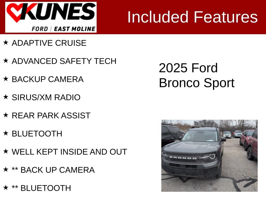 I got a 2025 Big Bend with the black diamond off road package. The steel modular front and rear in combination with bush guard gives this year model. A very aggressive off road look. With the ability to easily mount accessories and power them with the factory installed auxiliary switches. Hitch receiver seamlessly mounted into the rear steel bumper flanked by some very chunky recovery points. The upgraded aluminum rims wrapped with Continental all-terrains. It make this the most capable bronco sport yet. The interior of the 2025 has been updated with a new 13 inch touchscreen with Android Auto and apple car play. The lines of the dash flow elegantly from the new infotainment screen to the new all digital 12 inch gauge chaster. Toggling through the different modes on the gauge chaster is very intuitive, and all the displays are laid out very cleanly. Moving from gauge chaster the center storage cubby just below the infotainment screen there is a wireless charger and USB/ USB-c ports. The passenger side of that same cubby gets a handle and a matching one on the roof just in case the driver bucks a little too much. The passenger also gets a mesh storage area. That leads us to the fact this vehicle has tons of storage options all throughout. You have pockets on the sides of the front two seat big enough for the latest new phones. Very generous door storage on all four doors plus huge glove box and center console with 12 volt outlet. The back side of the center console has air vents and another 12 volt outlet plus a 110 outlet. Now getting to the cargo area it is massive for a crossover SUV. With off road package you get a cargo management system and a very nice rubber mat. Under that there is a full size tire plus scissor jack and funnel to use with the capless filler system. On the liftgate there isa pair of very bright led lights turned on with a switch in the cargo area. This feature packed vehicle has tons awesome gadgets and hidden a little homages I spend all day just talk that. At the end of the day it is car. So how does it drive. It is wonderful, the steering and pedal response is beautiful. Rides very smooth and little to no road noise going down the highway. The active cruise control and co-pilot 360 have been very handy. The car literally drives itself most of the time. There is not enough good things I could same about this car. I love it and you pick one too. You will see what I mean.