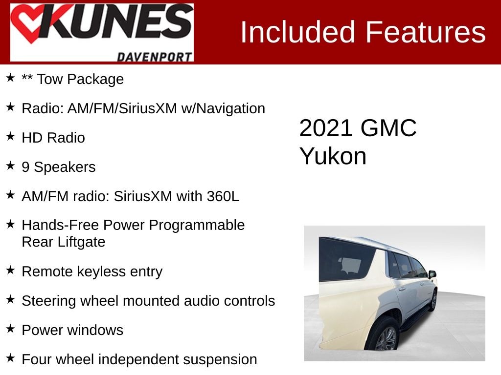 ** Heated Seats, ** Moonroof, ** 3rd Row Seat, ** Backup Camera, ** Bluetooth, ** Dual Power Seats, ** Heated Steering Wheel, ** Lane Departure Warning, ** Navigation GPS, Advanced Safety Features, ** Tow Package, 4WD, 12-Way Power Seat Adjusters, 3.23 Rear Axle Ratio, 3rd row seats: split-bench, 9 Speakers, AM/FM radio: SiriusXM with 360L, Apple CarPlay/Android Auto, Bodyside moldings, Brake assist, Bright Chrome Bodyside Moldings, Bright Front & Rear Door Sill Plates, Bumpers: body-color, Chrome Door Handles w/Body-Color Strip, Compass, Driver door bin, Driver vanity mirror, Electronic Stability Control, Emergency communication system: OnStar and GMC connected services capable, Following Distance Indicator, Four wheel independent suspension, Front Bucket Seats, Front Center Armrest, Fully automatic headlights, Garage door transmitter, Hands-Free Power Programmable Rear Liftgate, HD Radio, Heated & Ventilated Driver & Front Passenger Seats, Heated Driver & Front Passenger Seats, Heated front seats, Illuminated entry, Inside Rear-View Auto-Dimming Mirror, IntelliBeam Automatic High Beam On/Off, Lane Keep Assist w/Lane Departure Warning, Leather steering wheel, Low tire pressure warning, Occupant sensing airbag, Outside temperature display, Overhead console, Panic alarm, Passenger door bin, Passenger vanity mirror, Perforated Leather Seating Surfaces, Power Liftgate, Power windows, Radio: AM/FM/SiriusXM w/Navigation, Rain sensing wipers, Rear anti-roll bar, Rear Cross Traffic Alert, Rear Pedestrian Alert, Rear reading lights, Rear seat center armrest, Rear window wiper, Remote keyless entry, Speed-sensing steering, Split folding rear seat, Spoiler, Steering wheel mounted audio controls, Tachometer, Telescoping steering wheel, Tilt steering wheel, Traction control, Trip computer, Variably intermittent wipers, Ventilated front seats, Voltmeter, Wheels: 20" x 9" 6-Spoke Polished Aluminum.