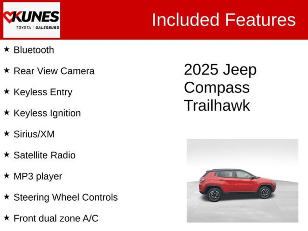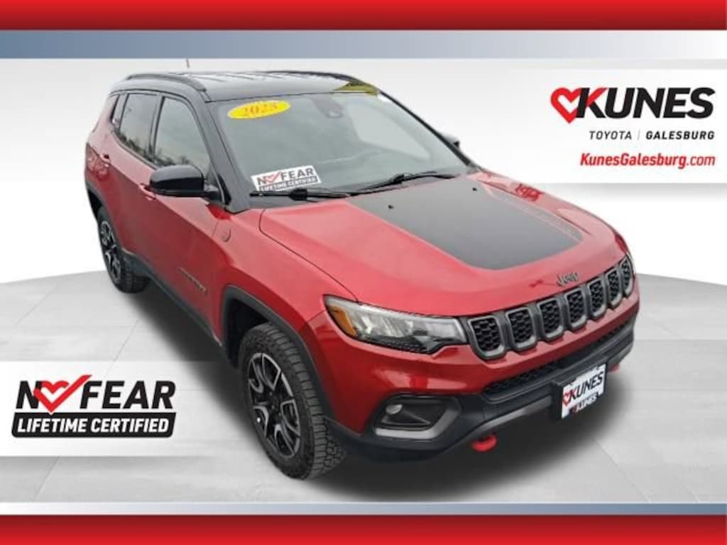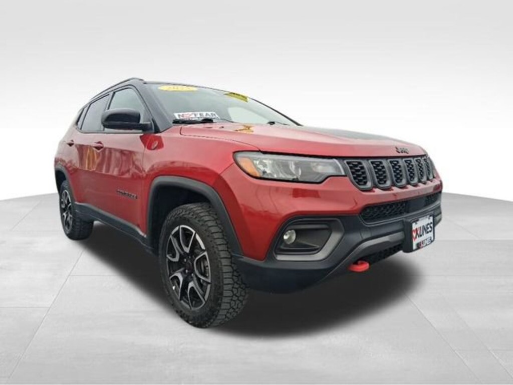 2025 Jeep Compass Trailhawk Red Hot Pearlcoat CARFAX One-Owner. Bluetooth, Rear View Camera, Keyless Entry, Keyless Ignition, Sirius/XM, Satellite Radio, MP3 player, Steering Wheel Controls, 4WD, Emergency communication system: Jeep Connect, Front dual zone A/C, Panic alarm, Premium Cloth/Leather Trim Bucket Seats.