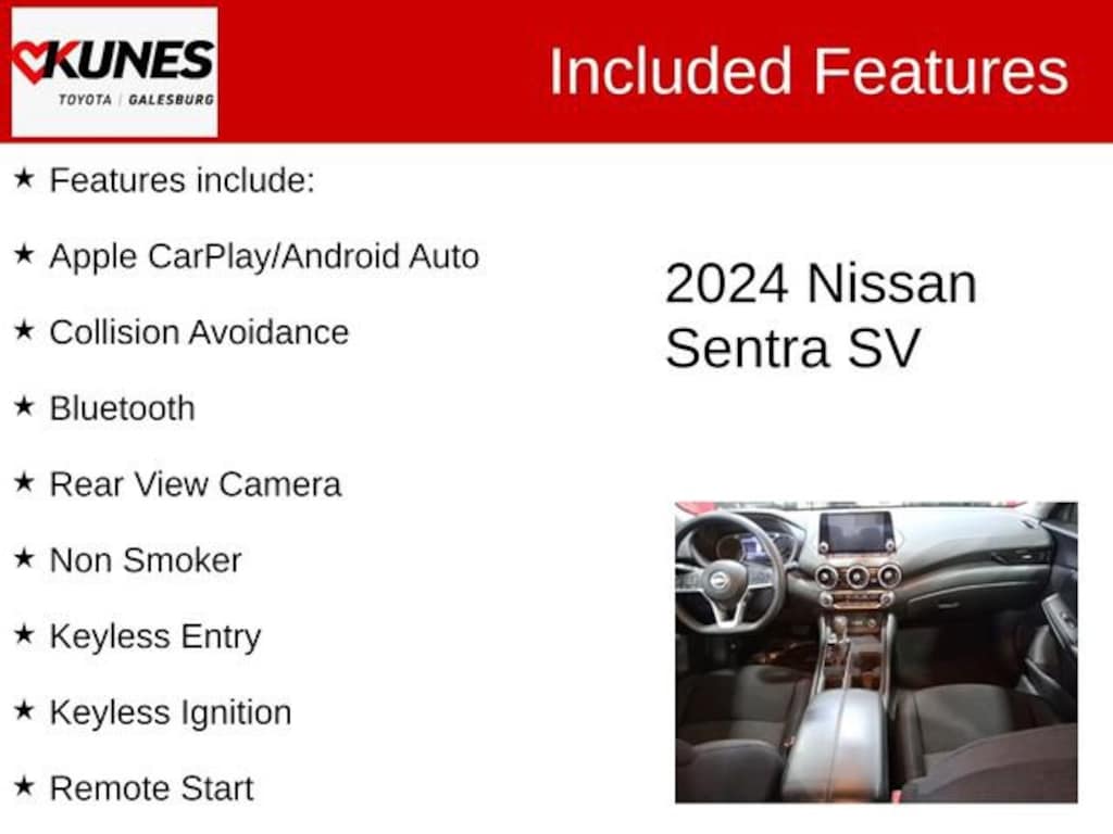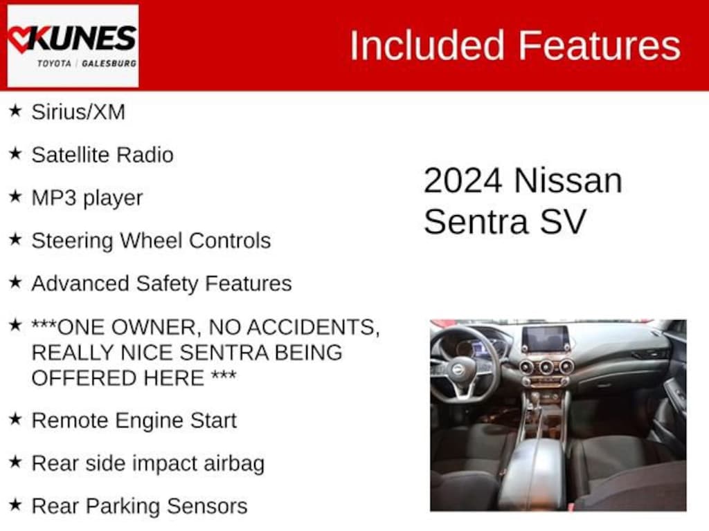 2024 Nissan Sentra SV Fresh Powder CARFAX One-Owner. Clean CARFAX. Features include:, Apple CarPlay/Android Auto, Collision Avoidance, Bluetooth, Rear View Camera, Non Smoker, Keyless Entry, Keyless Ignition, Remote Start, Sirius/XM, Satellite Radio, MP3 player, Steering Wheel Controls, Advanced Safety Features, ***ONE OWNER, NO ACCIDENTS, REALLY NICE SENTRA BEING OFFERED HERE ***, CVT with Xtronic, Charcoal w/Cloth Seat Trim, Rear Parking Sensors, Rear side impact airbag, Remote Engine Start.