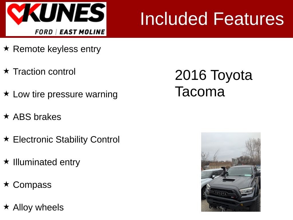 2016 Toyota Tacoma TRD Sport Magnetic Gray Metallic V6 4WD, ABS brakes, Alloy wheels, Compass, Electronic Stability Control, Illuminated entry, Low tire pressure warning, Remote keyless entry, Traction control.